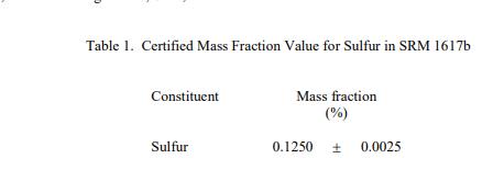 SRM 1617b 硫含量的認證值在表 1 中以質(zhì)量分數(shù) [2] 的形式報告。NIST 認證值是 NIST 對其準確性有最高置信度的值,因為所有已知的或懷疑的偏倚來源已被調(diào)查或考慮 [3]。認證值是根據(jù) NIST 和合作實驗室使用儀器測試方法進行的分析結(jié)果對真實值的當前最佳估計。