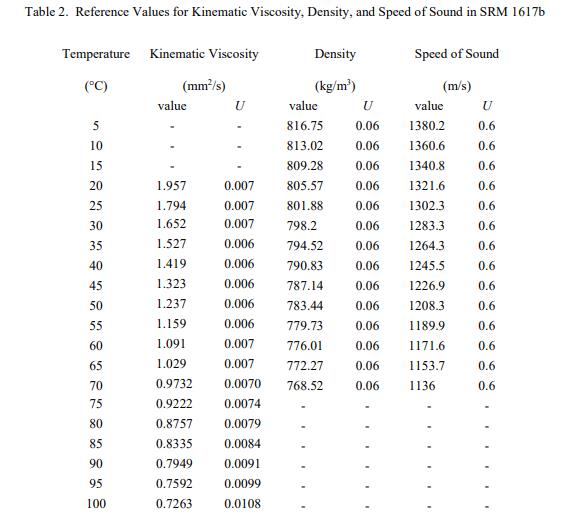 表 2 給出了 SRM 1617b 的運動粘度、聲速和密度的參考值。NIST 參考值是未經(jīng)認證的值,它是基于可用數(shù)據(jù)對真實值的最佳估計;但是,該值不符合 NIST 認證標準 [3],并提供了相關(guān)的