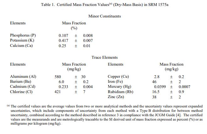 表 2 中提供了十一種成分的參考值,以基于干質(zhì)量的質(zhì)量分?jǐn)?shù)表示。參考值基于從單一 NIST 分析方法獲得的結(jié)果。參考值是未經(jīng)認(rèn)證的值,是對(duì)真實(shí)值的估計(jì)。但是,這些值不符合 NIST 認(rèn)證標(biāo)準(zhǔn),并且提供了相關(guān)的不確定性,可能不包括所有不確定性來(lái)源 [2]。信息值:表 3 中提供了兩個(gè)元素的信息值。信息值是一個(gè)值SRM 用戶可能感興趣,但沒有足夠的信息來(lái)評(píng)估與值相關(guān)的不確定性 [2]。信息值不能用于建立計(jì)量溯源性。